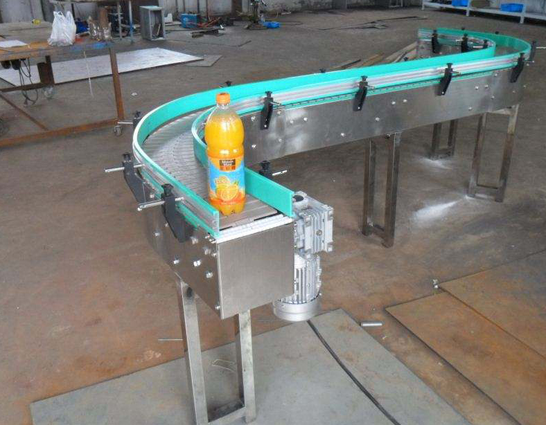 平頂鏈輸送機在飲料行業中一般是用來運輸圓柱形的瓶裝罐裝等生產的材料,有效利用空間和設備的鏈接,實現空間上的垂直運輸,生產的過程中避免瓶子在生產間隙長時間的滯留。